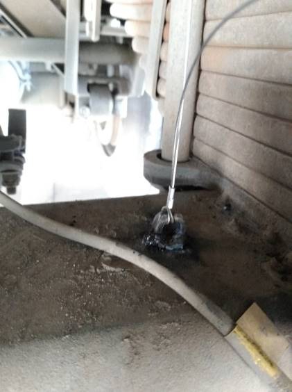 1.下圖傳感器的支架被頂彎曲變形,是因為傳感器的低端的部位與車體的部位挨著太近,車輛運行起來,上下晃動,和傳感器相碰撞,導致傳感器支架彎曲變形,從而影響了測量效果。